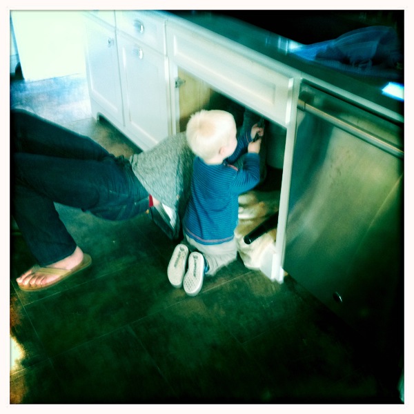 Had is been me stuck underneath that sink I would have been so annoyed by my "helper" crawling all over me and stealing my tools. But RJ has the patience of Job. He didn't seem to mind at all when Landon jumped on his stomach to grab a nearby tool, or blocked Dad out to get a better look himself. And despite the fact RJ was pretty upset about the water damage he kept his voice upbeat and positive while chatting with Landon.